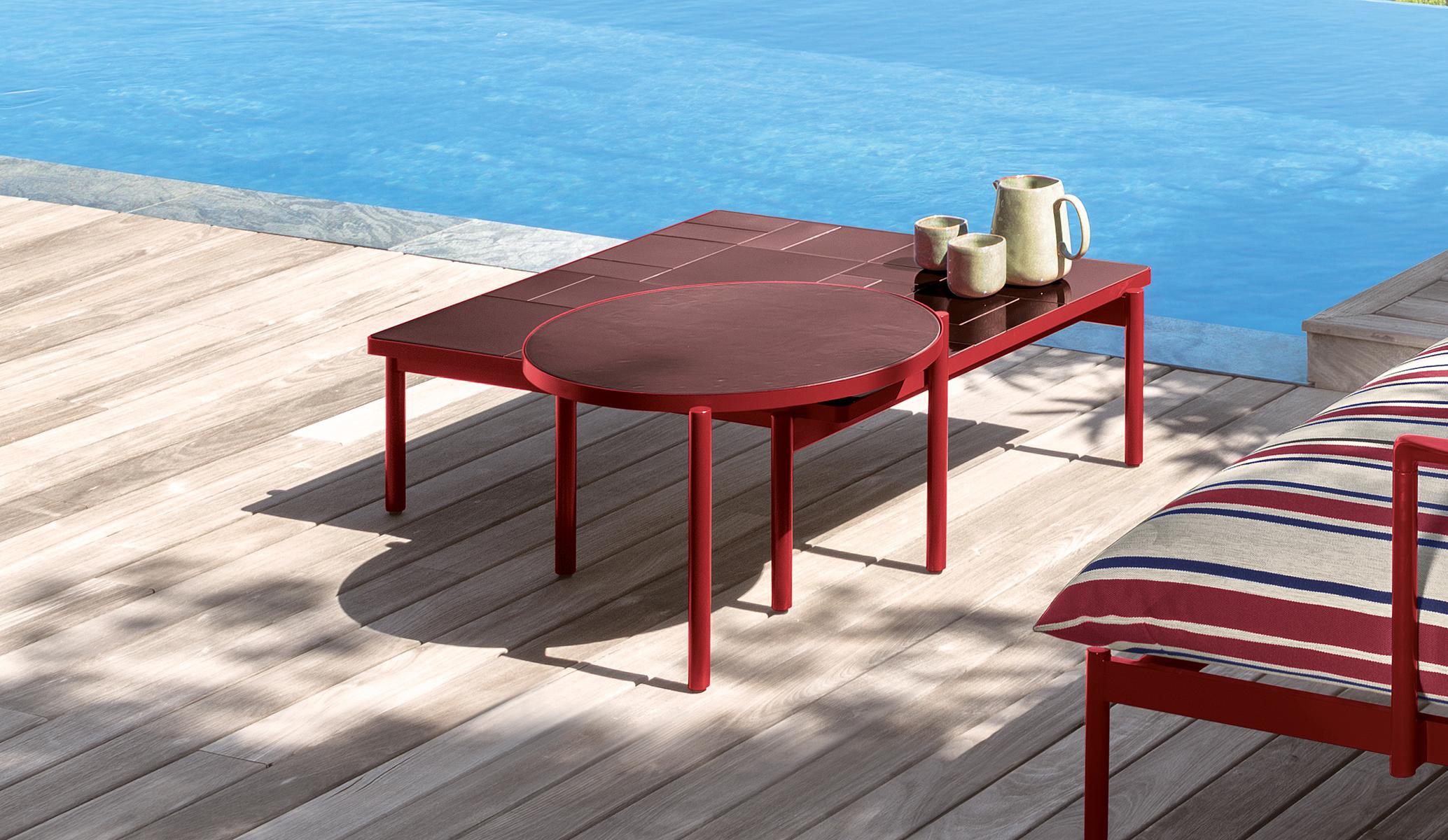A single circular floor of glazed stoneware resting on three legs in painted aluminium, is the perfect furnishing complement for a practical and refined living.