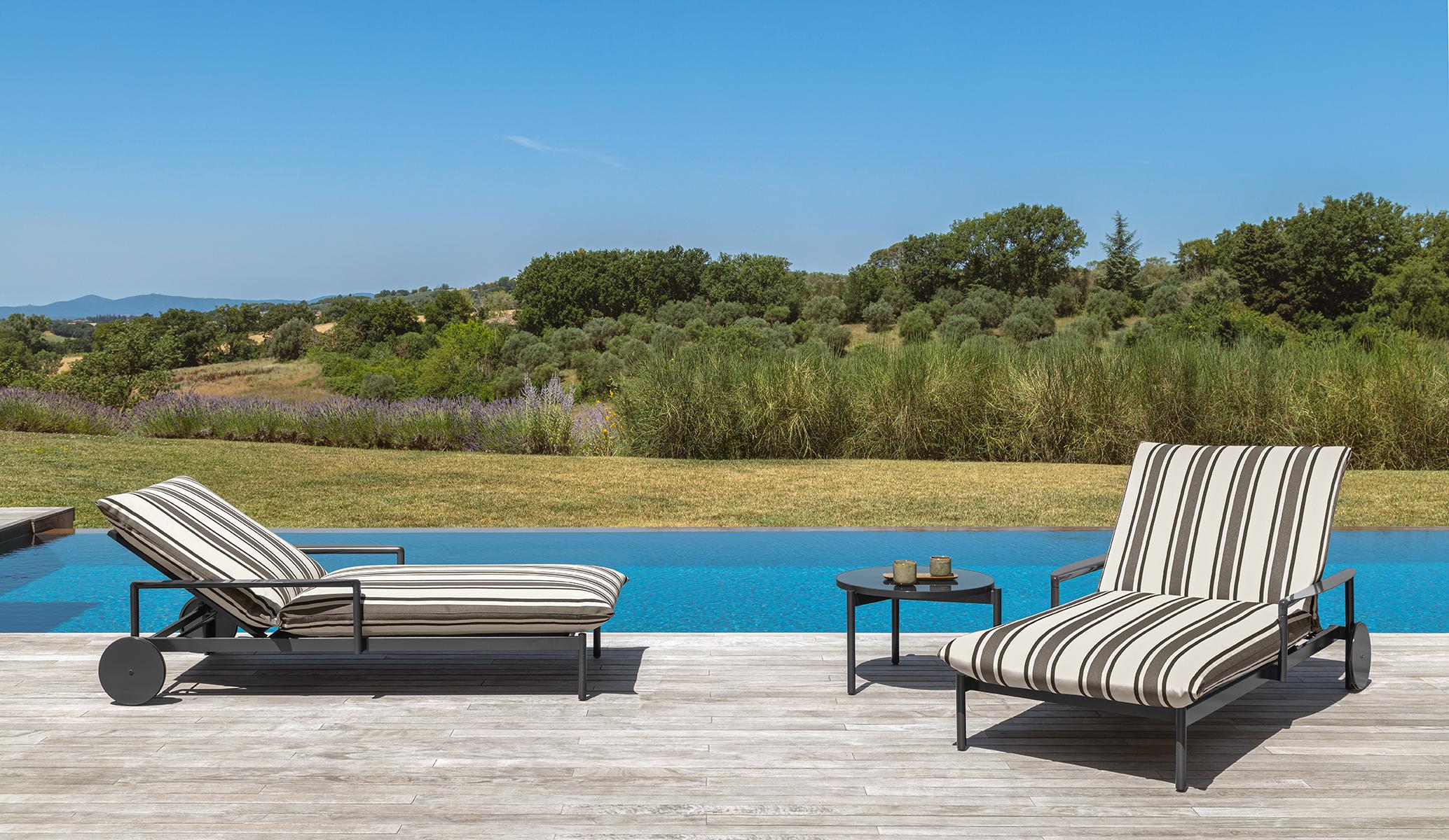 The first sun bed with armrests belongs to the Nalu collection of the studio Palomba-Serafini. The retro style with multi-stage adjustment mechanisms, allows you to live your own pool in total comfort.