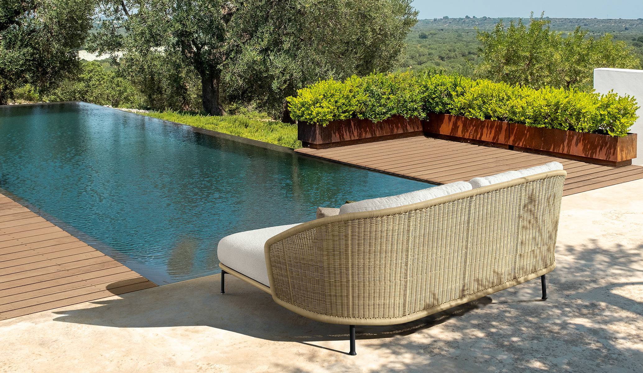 The daybed from the Nido collection is characterized by an essential but versatile structure, which adapts to various environments. The wicker-style woven backrest gives a soft and welcoming shape. The cushions, together with the backrest that transforms into an armrest, envelop those who sit, creating a corner of comfort and tranquility. Inspired by the idea of a nest, this product invites you to enjoy moments of relaxation in a refuge that welcomes and protects.