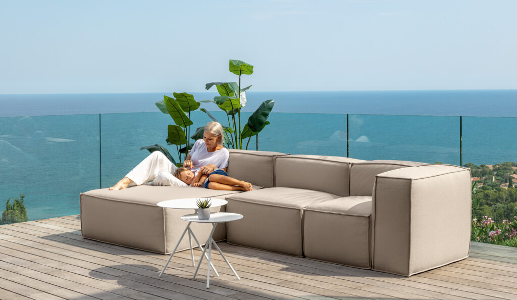 With its solid and sculptural shapes, the Ocean modular sofa offers the chance to shape the outdoor space according to your needs. The cushions, padded with quick dry foam, have removable covers, easy to wash and weather-resistant. The bold fabrics are wisely matched to the imposing and generous volumes of the cushions, making this sofa a timeless piece of furniture which combines functionality with refined design. The rich colour palette is well associated to the modularity of the single pieces, creating plays of nuances and shades that make this product the hallmark of your outdoor furniture.