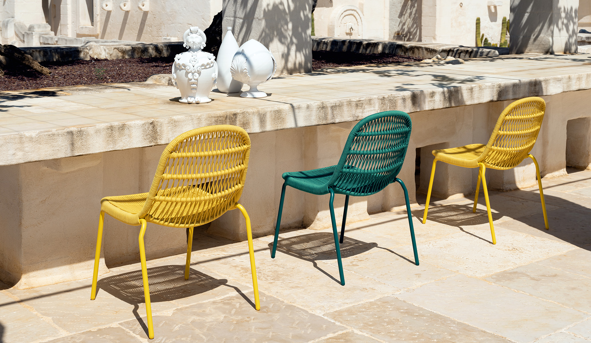 Designed for a moment of relax, the Dining Chair is in line with all the products of the Panama collection. The high seat ensures body support thanks to the synthetic nautical ropes which make up the backrest. The structure is realized in aluminium, light and resistant.  Available in many combinations of colours, the Chair can be personalized  with cushions (optionals) in order to make the product complete.