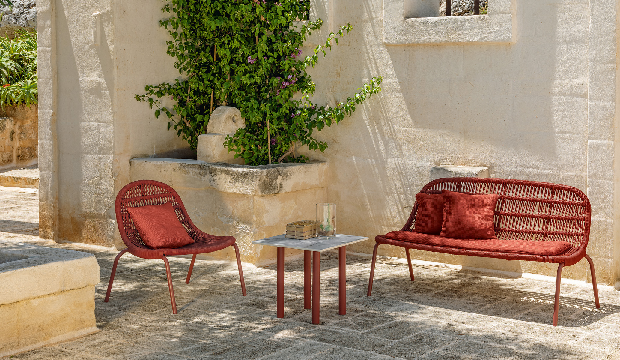 Living Armchair from Panama collection turns out to be a compact and design product. The aluminium structure, solid but light, acts as a base for a weave of synthetic nautical ropes, perfect for outdoor furniture.  The light and curvy lines of the Armchair don’t give up on functionality as it is easy stackable.