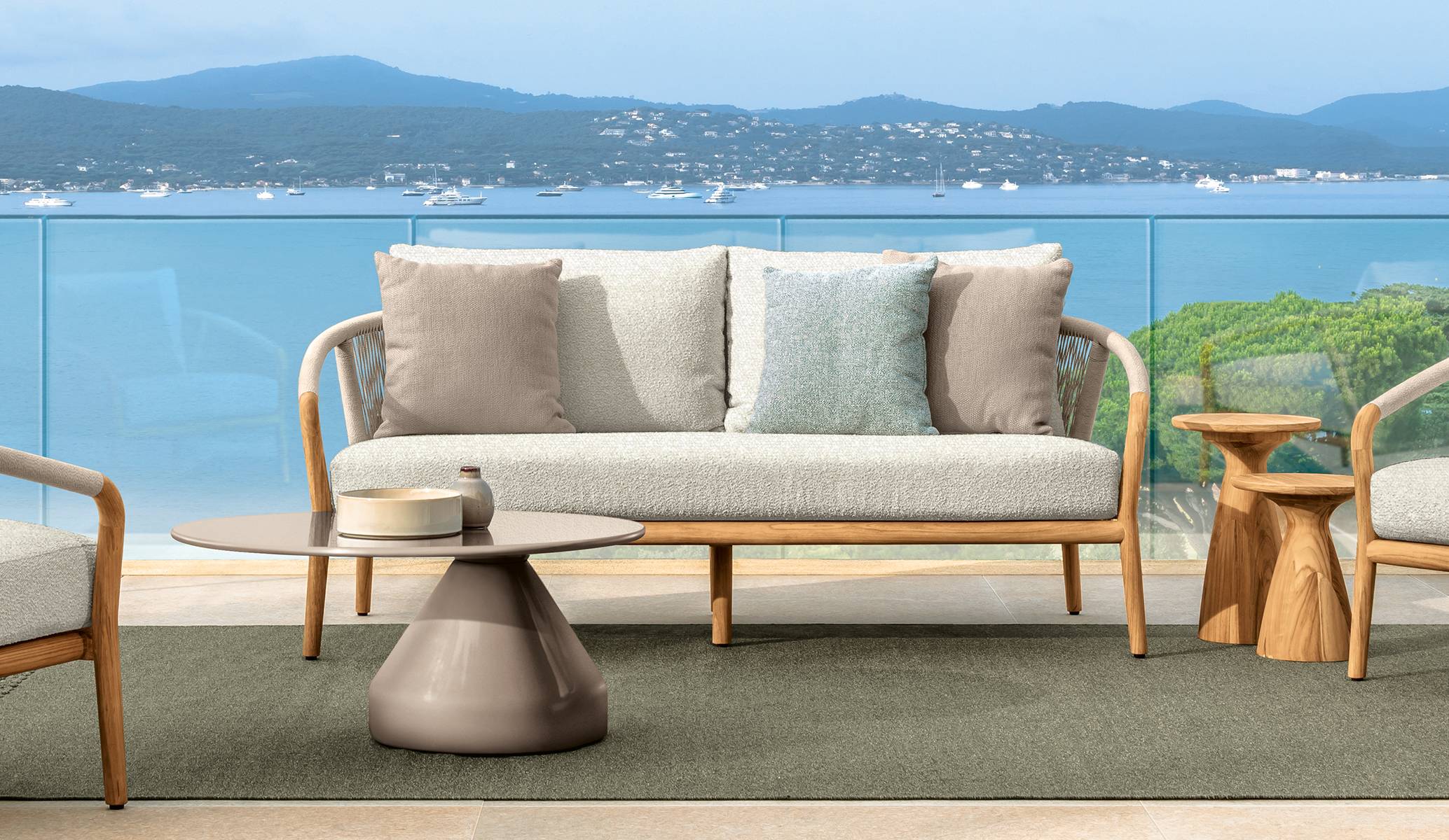 The two-seater sofa from the Parker collection is characterized by a modern and elegant design. It is composed of a teak wood structure and curved armrests that add refinement. The cushions are present in neutral shades, creating a welcoming and harmonious visual effect making this sofa ideal for contemporary and bright outdoor spaces.
