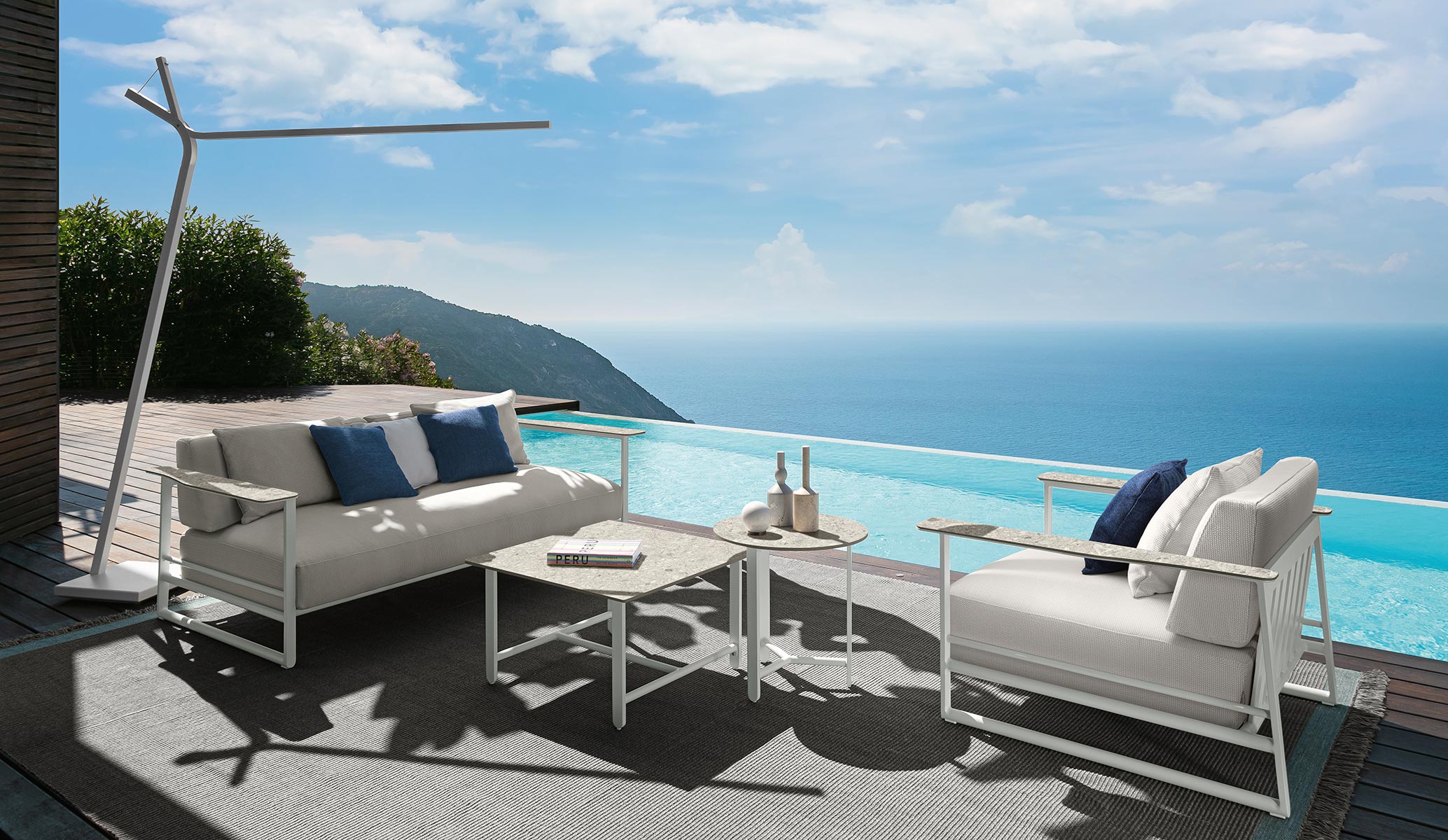 The Riviera two-seater sofa stands out for its elegant and bright lines that perfectly adapt to your outdoor living space. The refined aesthetics and the fine materials do not compromise the functionality of this product, ensured by the aluminium frame. The quick dry foam padding is upholstered with weather-resistant and removable covers, available in three different colours, wisely combined with the shades of the frame and of the gres armrests.