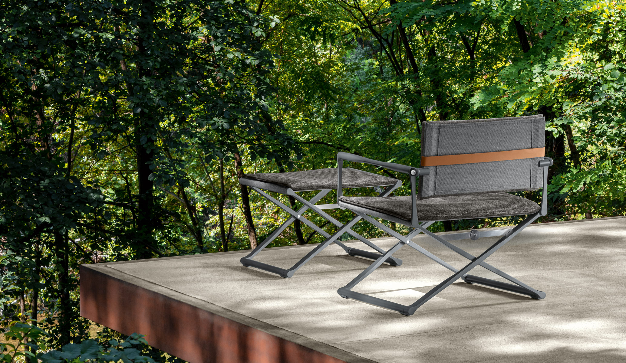The core elements of the collection, elegance and attention to the detail, are clearly shown in this director lounge armchair. The finely shaped aluminium frame, the leather finish supporting the backrest and the bold textures chosen for the cushions flow into this refined product that easily adapts to different locations. Its sophisticated design is well combined with the functionality of a product specifically designed for outdoor spaces.