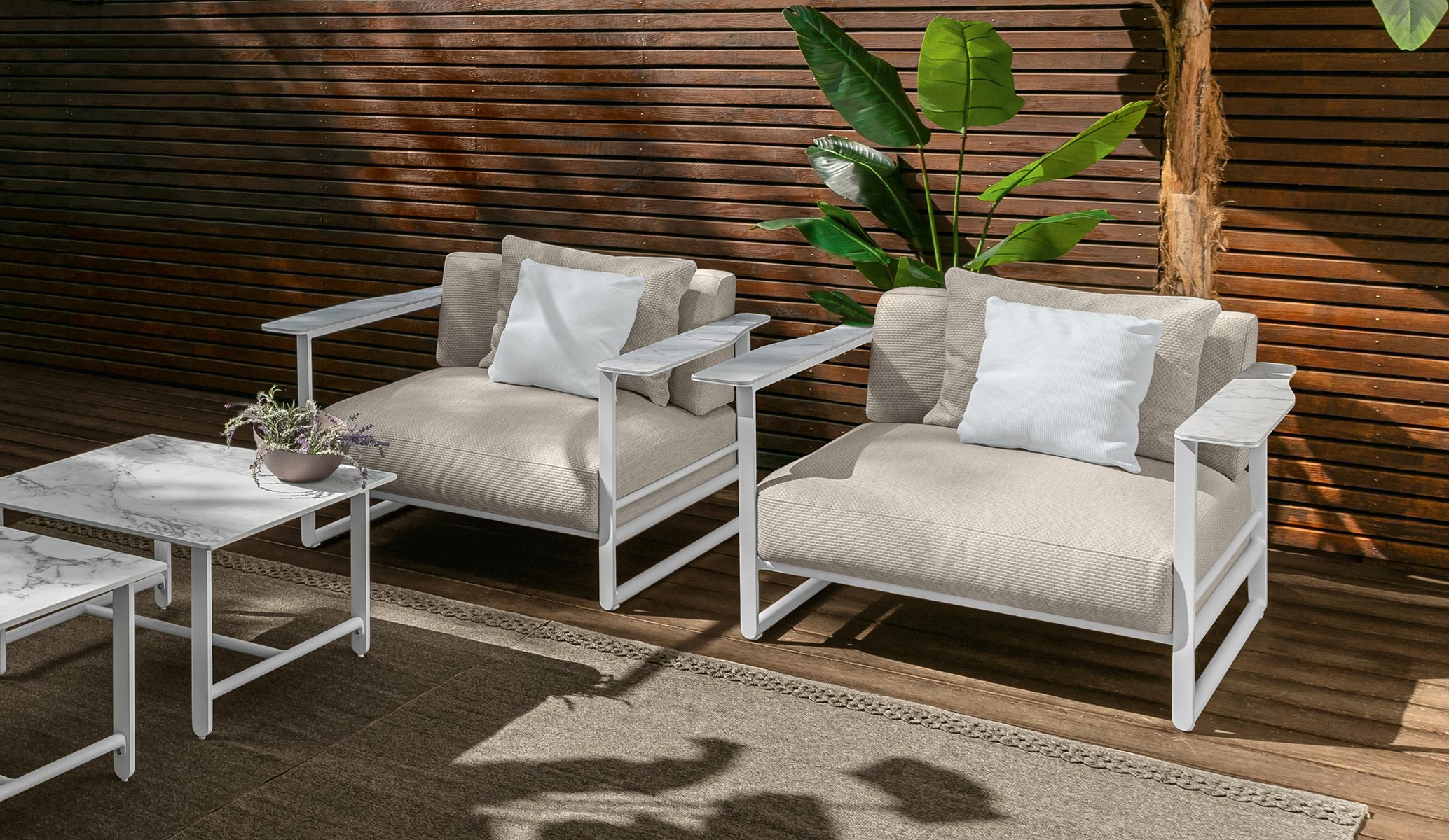 The Riviera living armchair, with its wide and deep seat, is the ideal choice to welcome your body in a relaxing moment. The aluminium frame, light and elegant, highlights the generous volumes of the cushions, enriched by the bold texture of the selected fabrics. The gres armrests sublimate the armchair, adding a refined touch to the whole collection: this is the perfect piece of furniture to enhance the style of your outdoor living space.