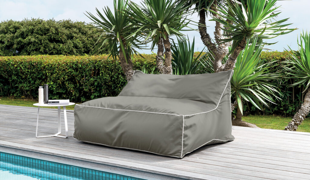 Its shape provides a high seating comfort while the colours of the fabrics grant sparkle and vivacity to any outdoor spaces, at the poolside or in your garden. It is made with a breathable, removable, easy-to-wash and weather-resistant fabric. In the padding there are flakes of quick dry foam and polystyrene balls. The fabric is available in the following monocolour tone: white, blue, green, taupe and grey. In the two-tone version the combinations are: grey and striped grey, green and striped green, taupe and striped taupe, white and striped blue.