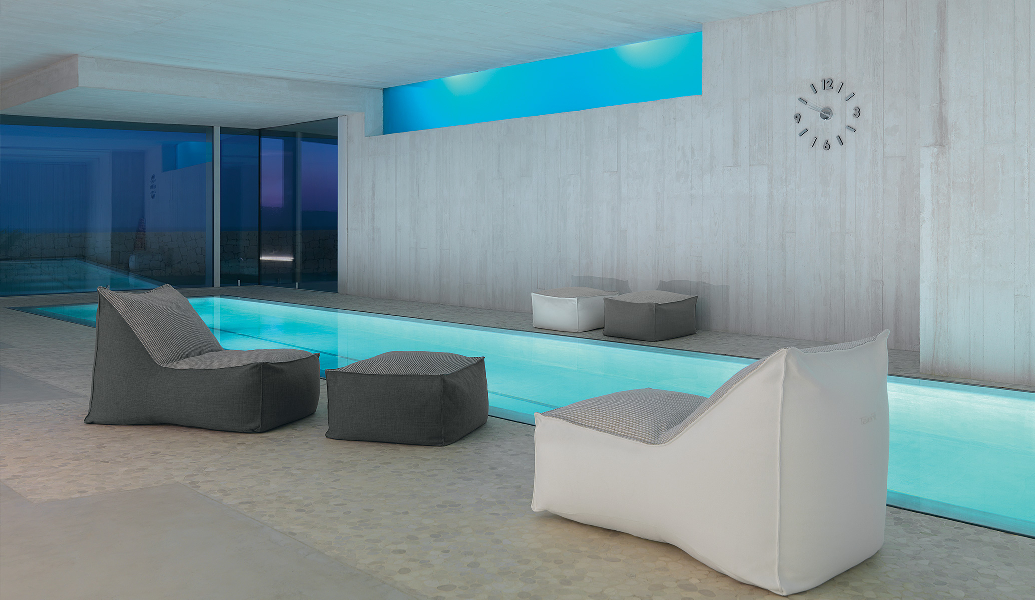 In the padding there are flakes of quick dry foam and polystyrene balls. The fabric is available in the following monocolour tone: white, blue, green, taupe and grey.