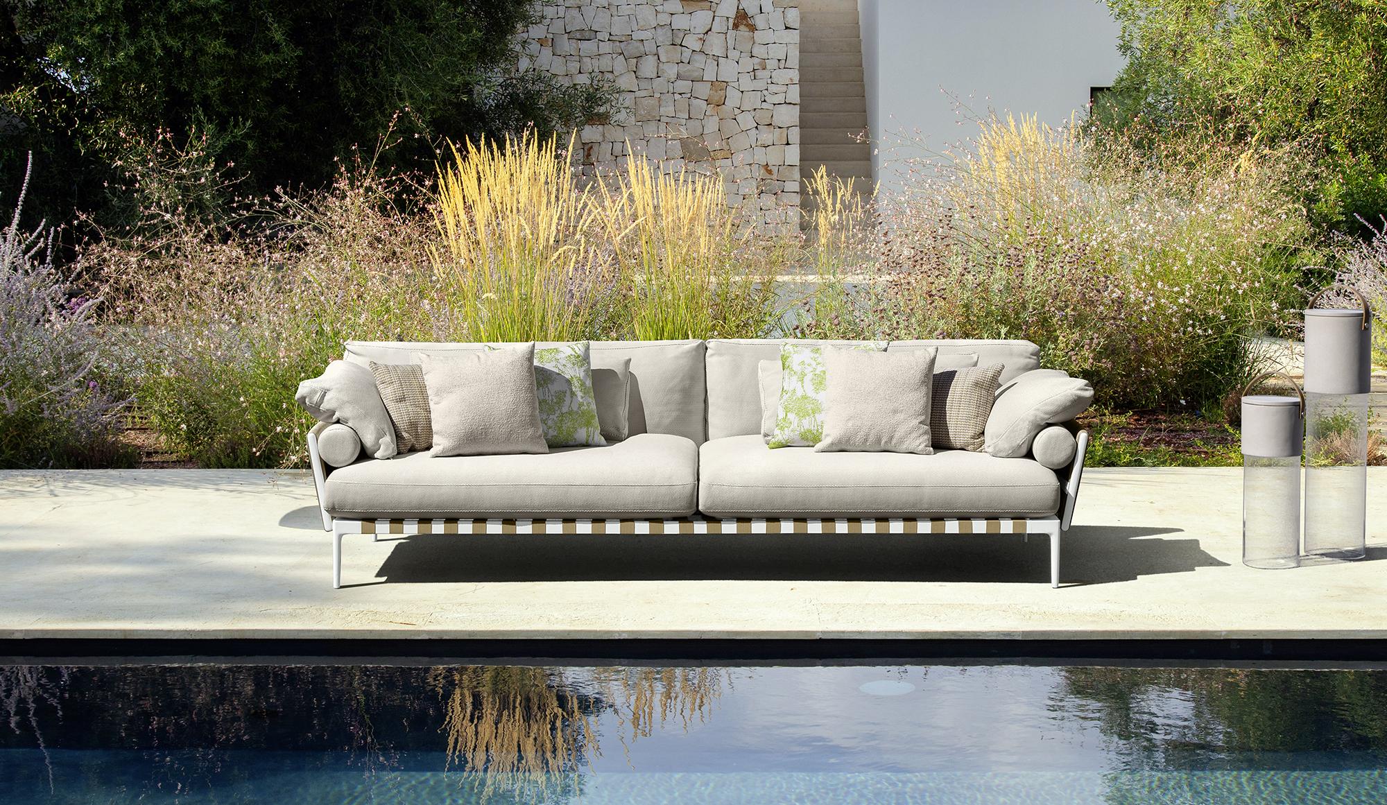 The three-seater sofa Salinas expresses the refinement typical of the indoor world outdoors, through the preciousness of the fabrics. The refined chromatic range evokes the colors of sand and sea, giving the outdoor environment a natural timeless charm. The soft lines of the cushions are enhanced by the use of the padded strap in the back that becomes a design element. A piece of furniture that offers continuity between interior and exterior.