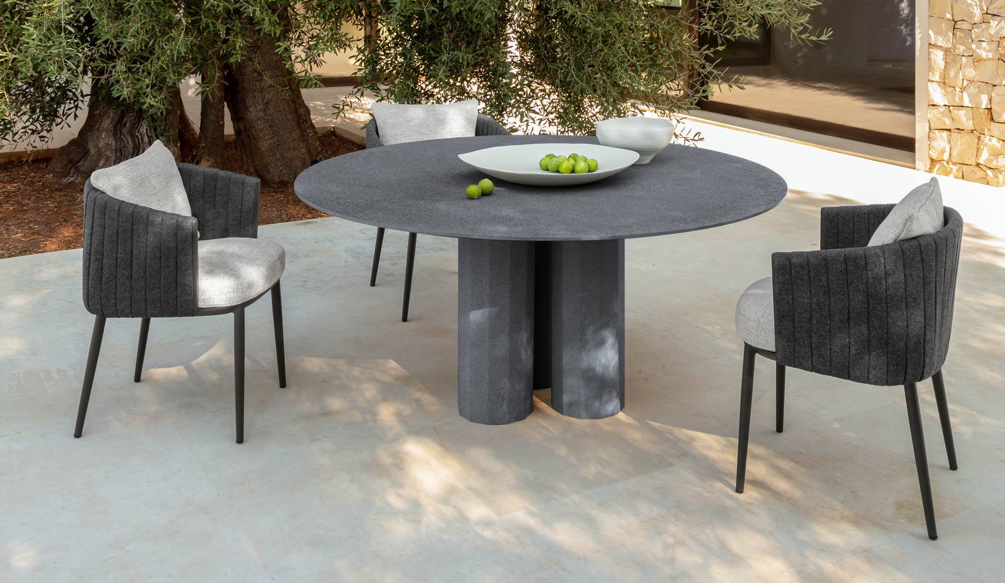 The dining table of the Salinas collection gives charm and refinement to the outdoor environment in which it is inserted. The design emphasizes the solidity of the concrete, and infuses elegance and continuity between the outdoor environment and the garden. The distinctive feature of the Salinas garden tables is the classic style columns on which the top rests.