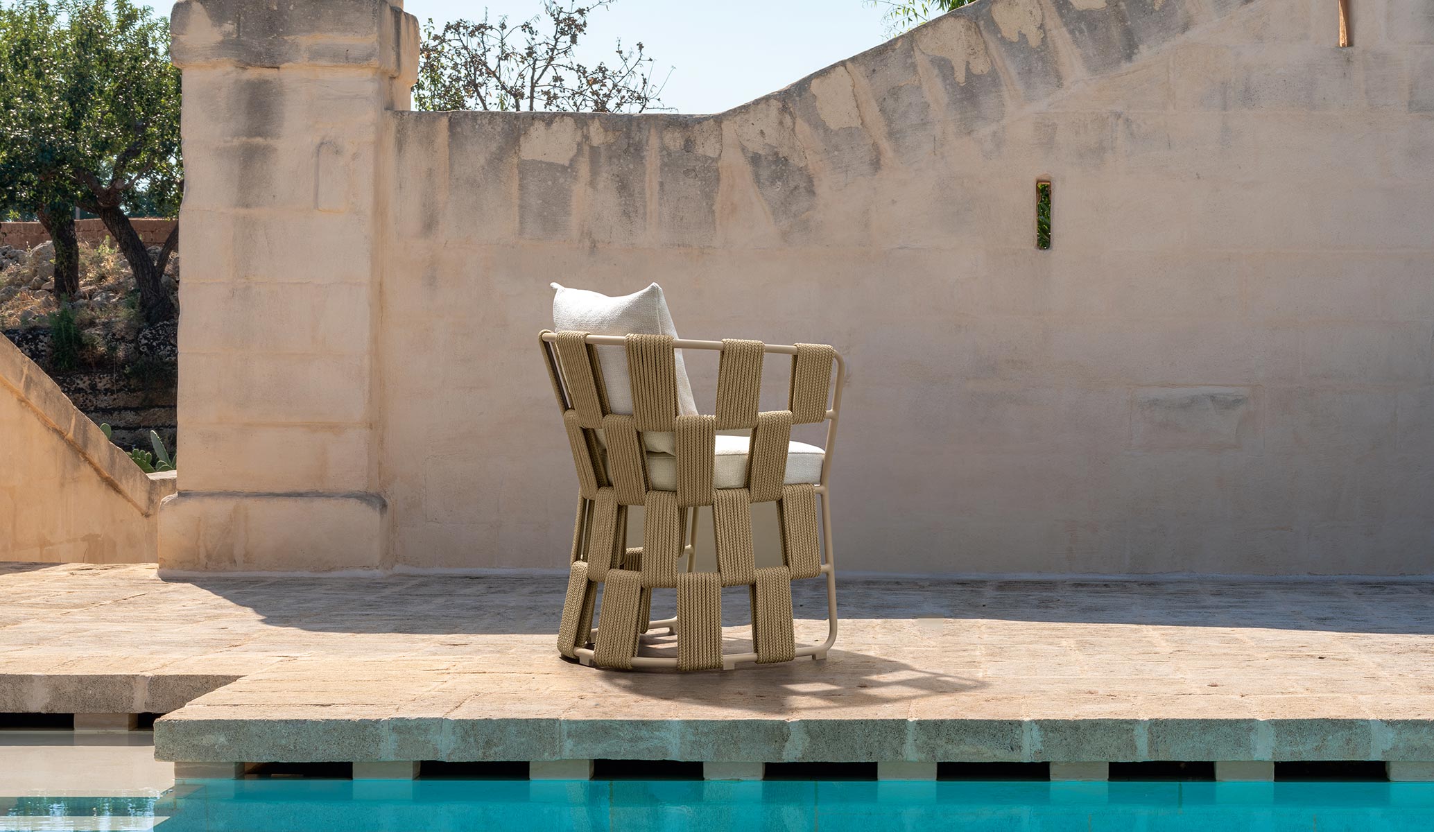 The Scacco dining armchair combines the strength and the elegance of aluminium with the beautiful geometric pattern of the rope charcaterizing the backrest. The softness and the roundness of the seat pefectly adapts to the surprising and original effects of the rope.