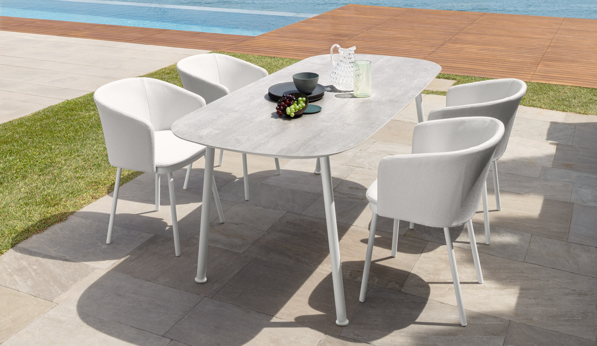 The skillful combination between clean and soft lines and the high-quality chosen materials makes the 190×90 dining table a fundamental piece of furniture for a stylish outdoor decor. The stoneware top and the solid aluminium structure ensure a good weather-resistance, making this product perfect for outdoor use.