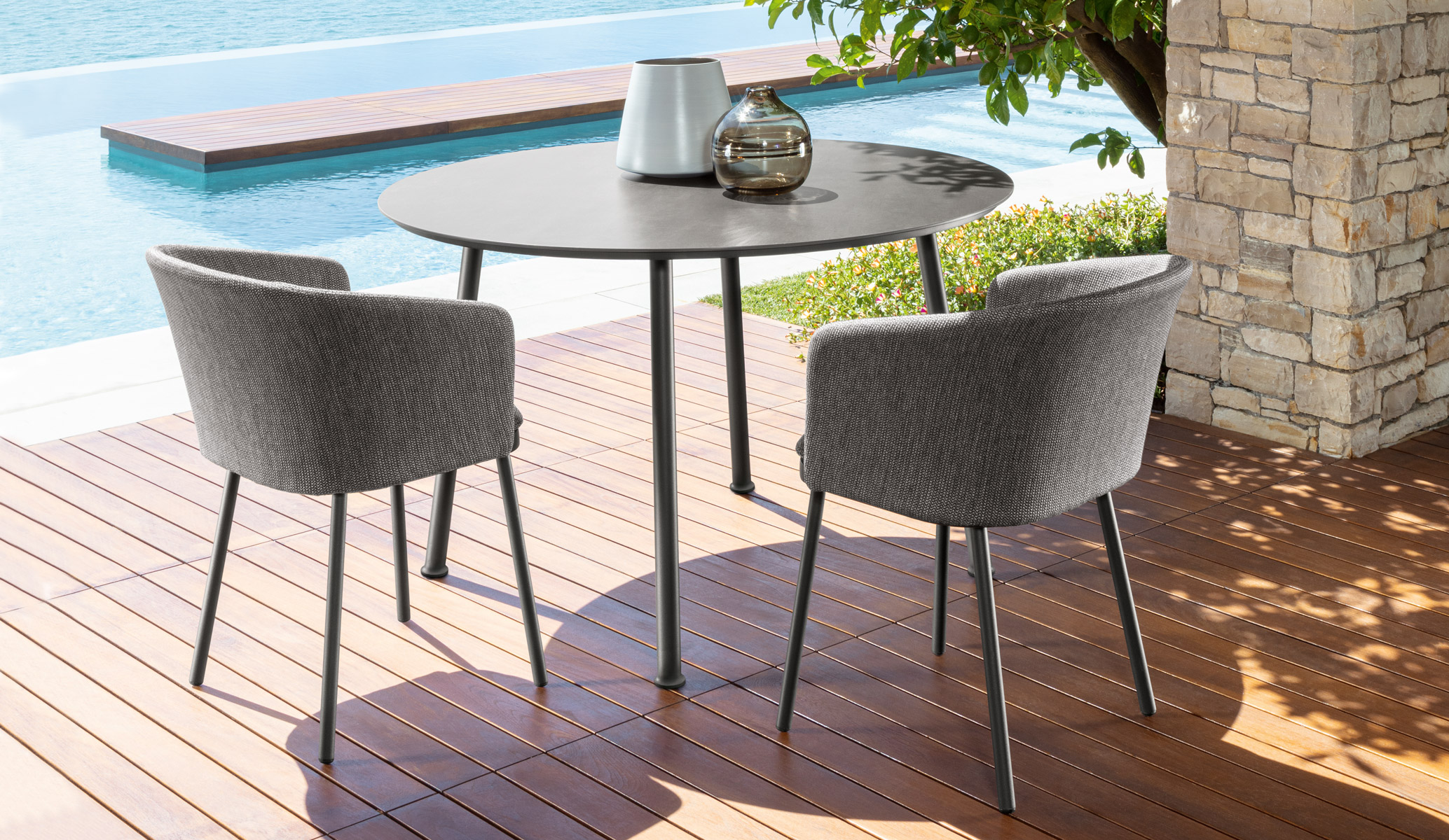 In line with the style of the entire collection, the slam round dining table is characterized by a compact size, ideal to guest up to 6 people. The combination with the dining armchairs creates a space with airy and gentle shapes, offering the chance to enjoy relaxing moments in the outdoor area. The attention to details and the high-quality materials make this product a weather-resistant and timeless furniture piece.