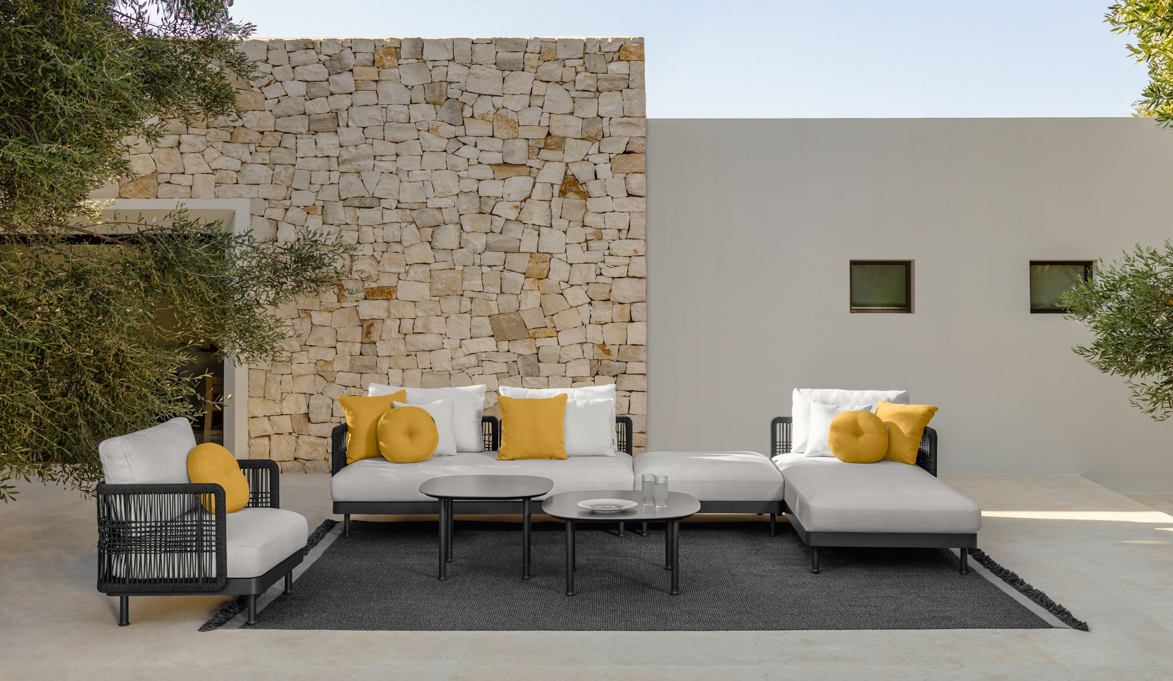The Slam // Rope modular sofa has a clean and elegant design. The essential lines of this sofa convey lightness and balance, thus making it adaptable to any outdoor environment. Thanks to the woven synthetic rope finishes and the removable and washable cushions, the Slam Rope sofa is the perfect solution for a living room to live over time without ever giving up comfort and style.