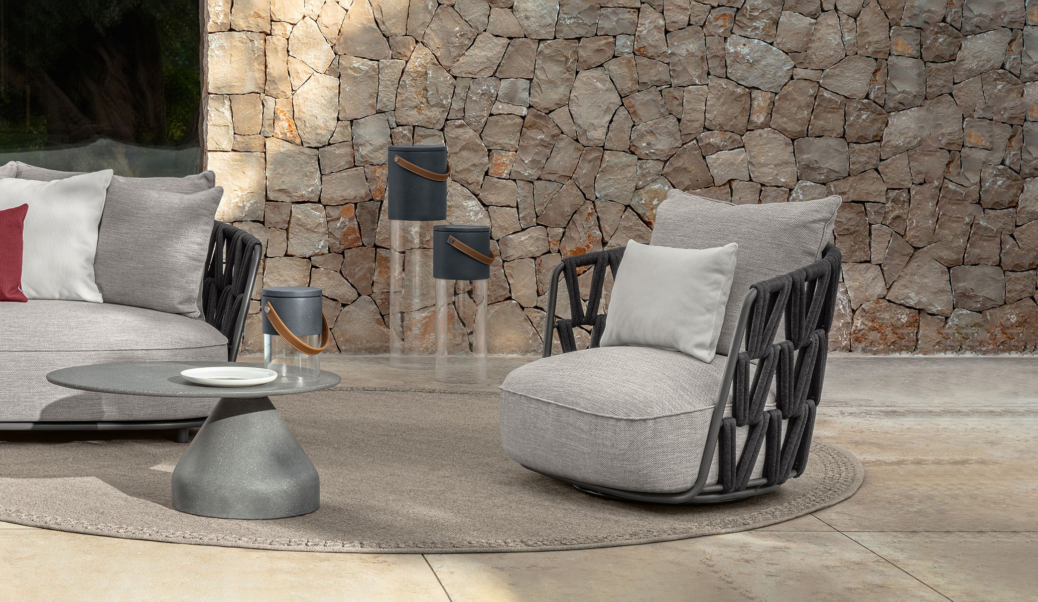 Ideal for a relaxing area, the Swipe living armchair offers maximum comfort thanks to its generous cushions. Armrests and backrest are enriched by a geometric woven padded rope, which expresses character and dynamism. The use of aluminum for the structure does not prevent this combination of elements to develop in total absence of rigidity and offer your outdoor living, personality and visual rhythm.