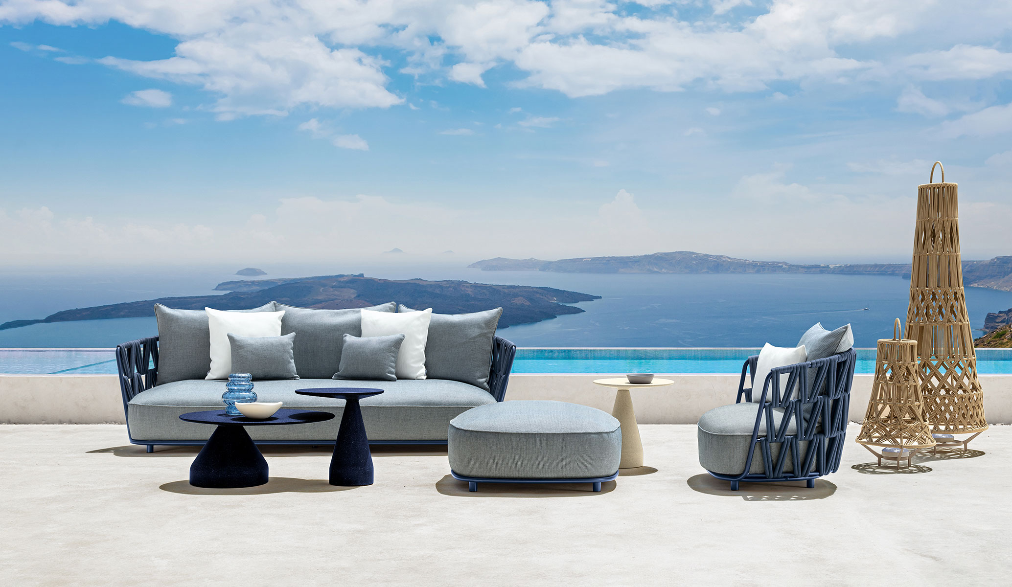 Swipe 2-seater sofa expresses lightness and movement through a design with a strong personality. The aluminium backrest, enriched by a dynamic padded rope weave, embraces the generous cushions, characterized by soft lines. This piece of furniture makes the outdoor living room comfortable and welcoming, giving unforgettable moments of shared relaxation. Available in a wide variety of colours, the Swipe sofa is versatile and adaptable to any outdoor context.