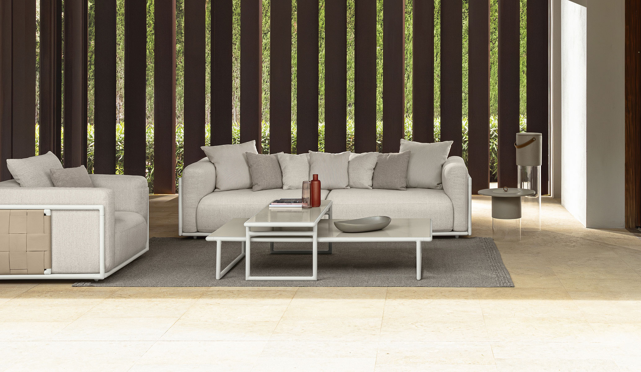 The Tressé coffee table is a sophisticated and functional design work. Every detail is taken care of with precision, with particular attention to the choice of materials. The hand-crafted glazed lava stone combines perfectly with the tubular aluminium structure, making it the ideal piece of furniture to give character to the outdoor living room.