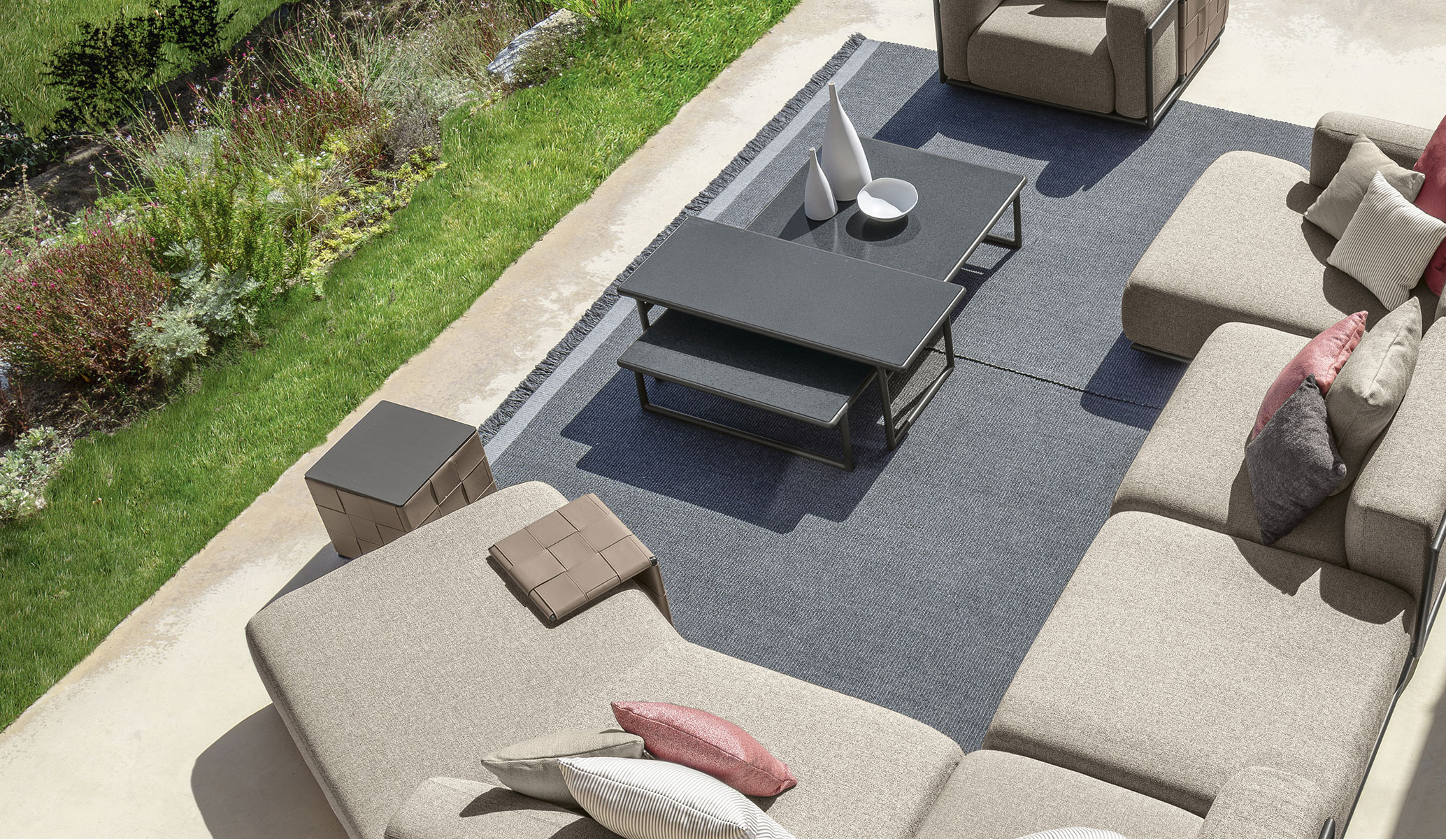 Primordial form from which the entire collection is born, this piece of furniture is functional both as a coffee table and as a table top in moments of relaxation. It fits in the outdoor environments with elegance, thanks to a sophisticated interweaving of leather bands, handmade. Thanks to the chromatic variations in which it is available, ranging from cold silk grey, to the most intense and decisive mud, up to stand out with the warm earth of Siena, it is able to adapt to any outdoor living area.