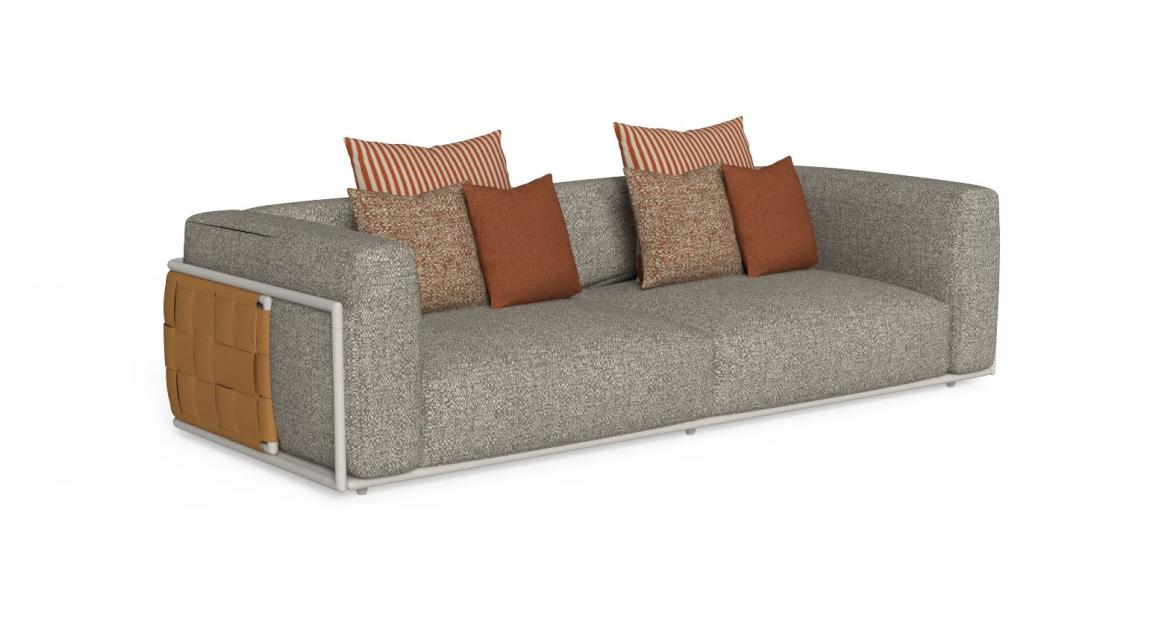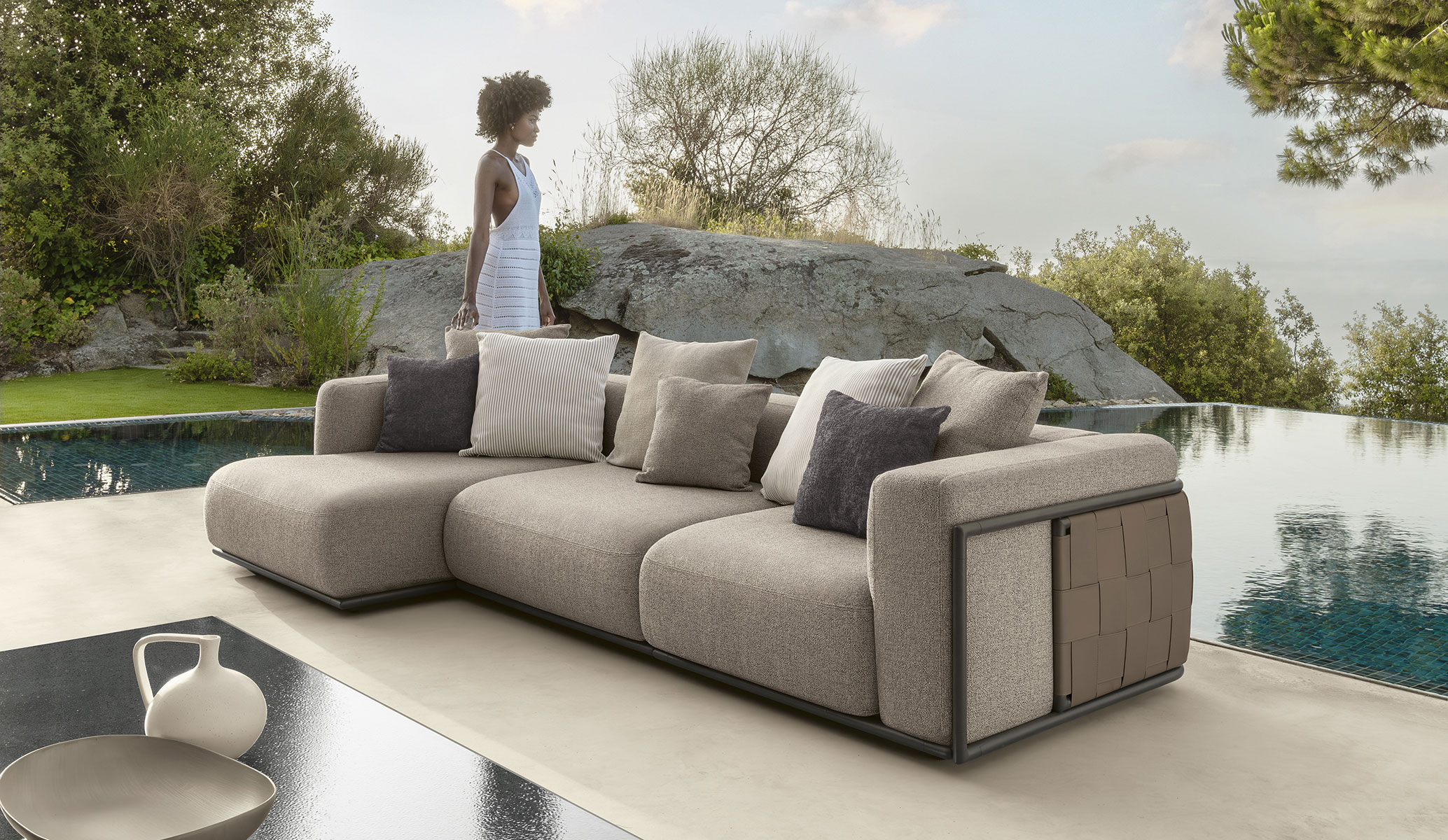 The modular sofa Tressé is perfect to enhance, with style and elegance, your outdoor living. The aesthetic concept of this sophisticated piece of furniture comes from the study of the primordial shape: the cube. This allows maximum compositional freedom in the customization of outdoor furniture, thanks to the many combinations and color variations ranging from cold gray silk, to the most intense and decisive mud, up to stand out with the warm land of Siena. The distinctive element, which characterizes the entire collection, is the tubular aluminum structure, enriched by a weave of hand-made eco-leather bands, which embraces the imposing cushions, giving an intense feeling of comfort.