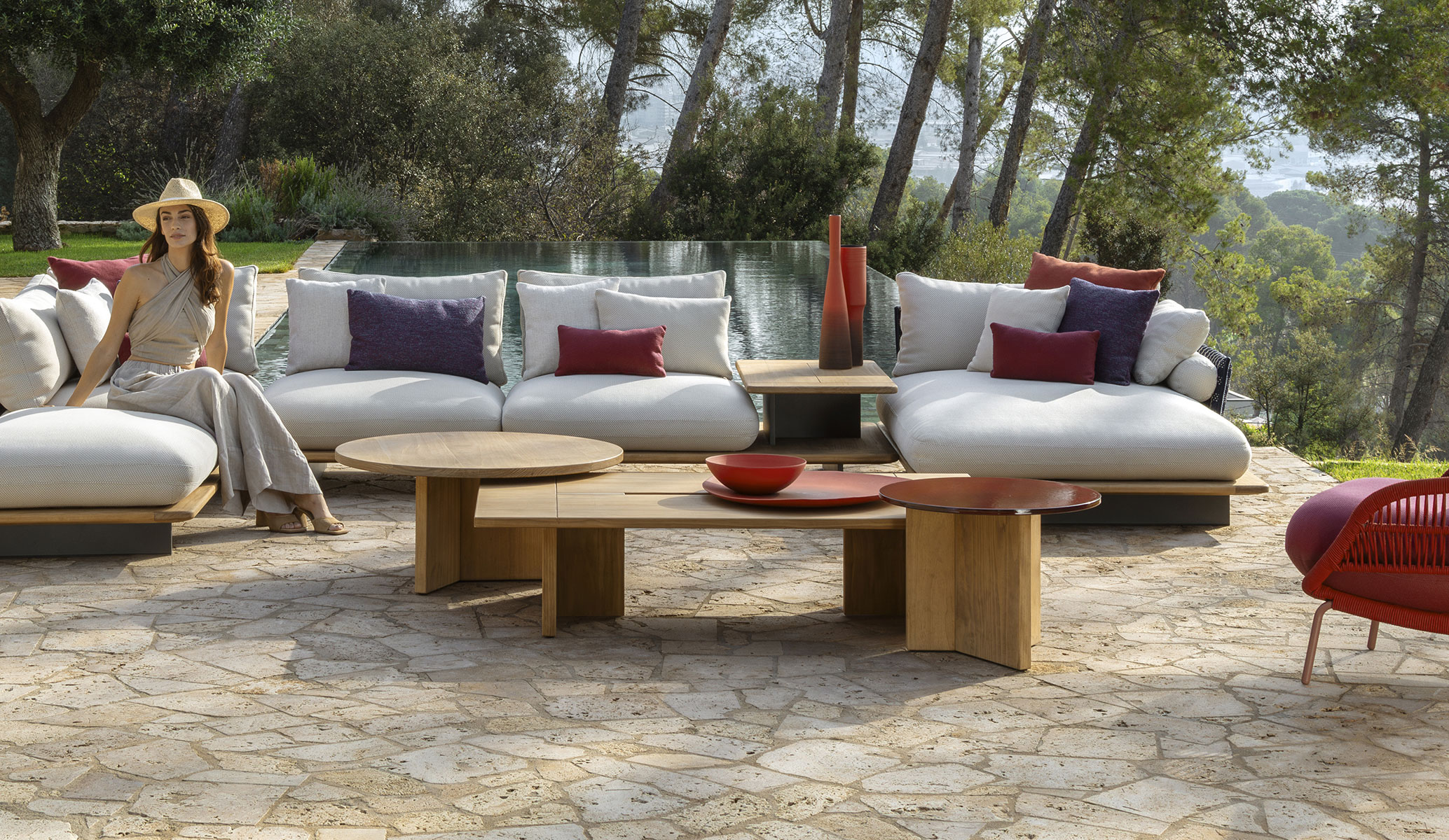 Art and elegance are the hallmark of the Venice coffee table, inspired by the most famous lagoon city. The ceramic lava stone top recalls the reflections of the water in the canals of Venice. The chosen colour range includes all the shades of the sea, from the warm sunset to the cold dusk. The design and structure of this piece of furniture have a monolithic charm that contrasts with the lightness expressed by accoya wood, and enriches the outdoor living room with a romantic atmosphere.