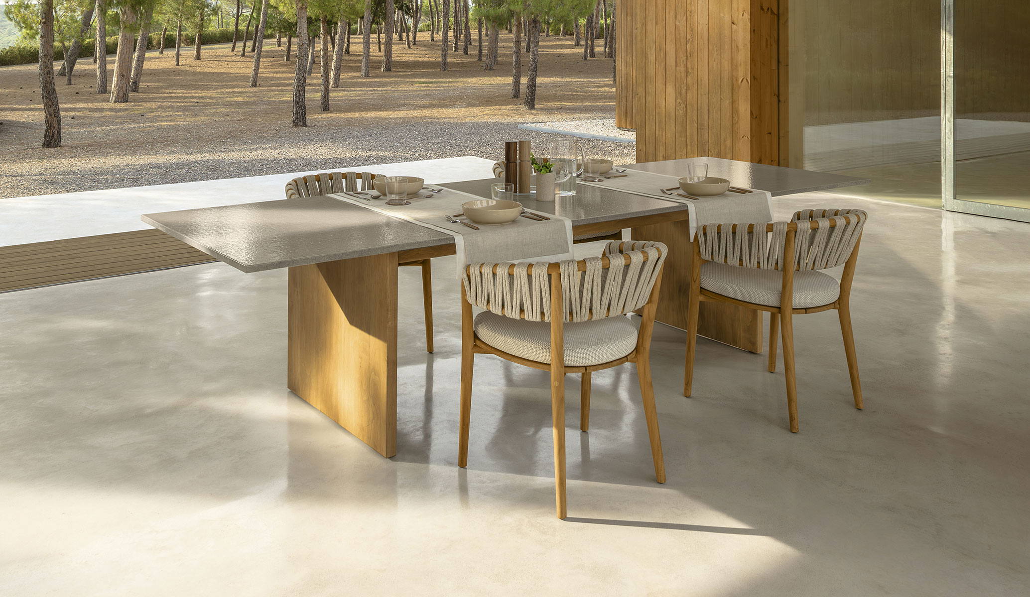 The Venice dining armchair, inspired by the famous lagoon city, is the perfect solution to enhance your living area in the garden. The solid teak wood frame embraces the wide and comfortable seat. The fabric of the cushions and the rope weave that wraps around the back, recall the classic nautical style and make the exterior refined and elegant.