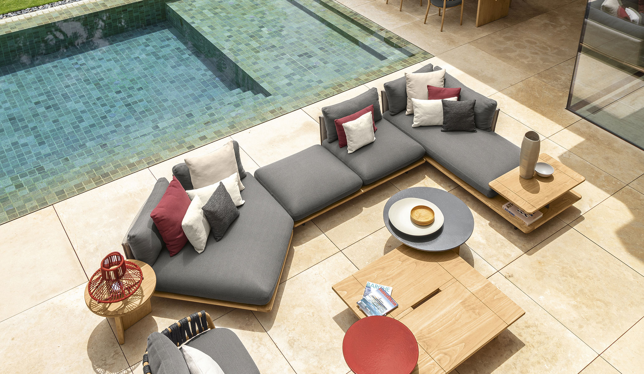 The modular sofa Venice recalls the image of boats that ply the Venetian waterway, thanks to the large seats, lying on the wooden bases with a floating design. The cushions are defined by soft lines, backs and armrests are covered in full nautical style and the bases in teak wood and accoya evoke the artisan finishes of the vessels. The combination of these elements conveys a sense of lightness and charm that radiates throughout the garden. The wide choice of materials and the many modular combinations in which it is available, allow you to customize and adapt the Venice sofa to the outdoor living room with great versatility.